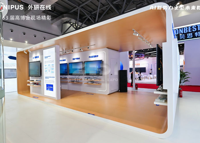 教育展會聚焦智慧教學、數字化資源等領域,長春教育展位搭建需兼顧 “科技感” 與 “教育溫度”。外研科技此次 360㎡展位以 “白色科技風” 為核心,實現三重價值落地: